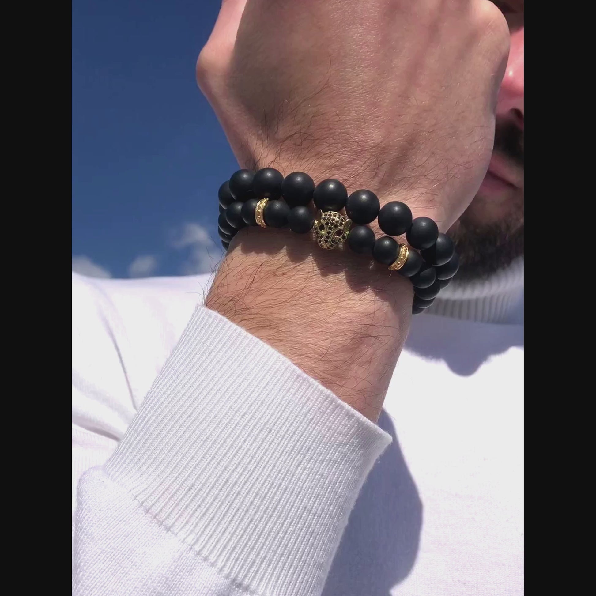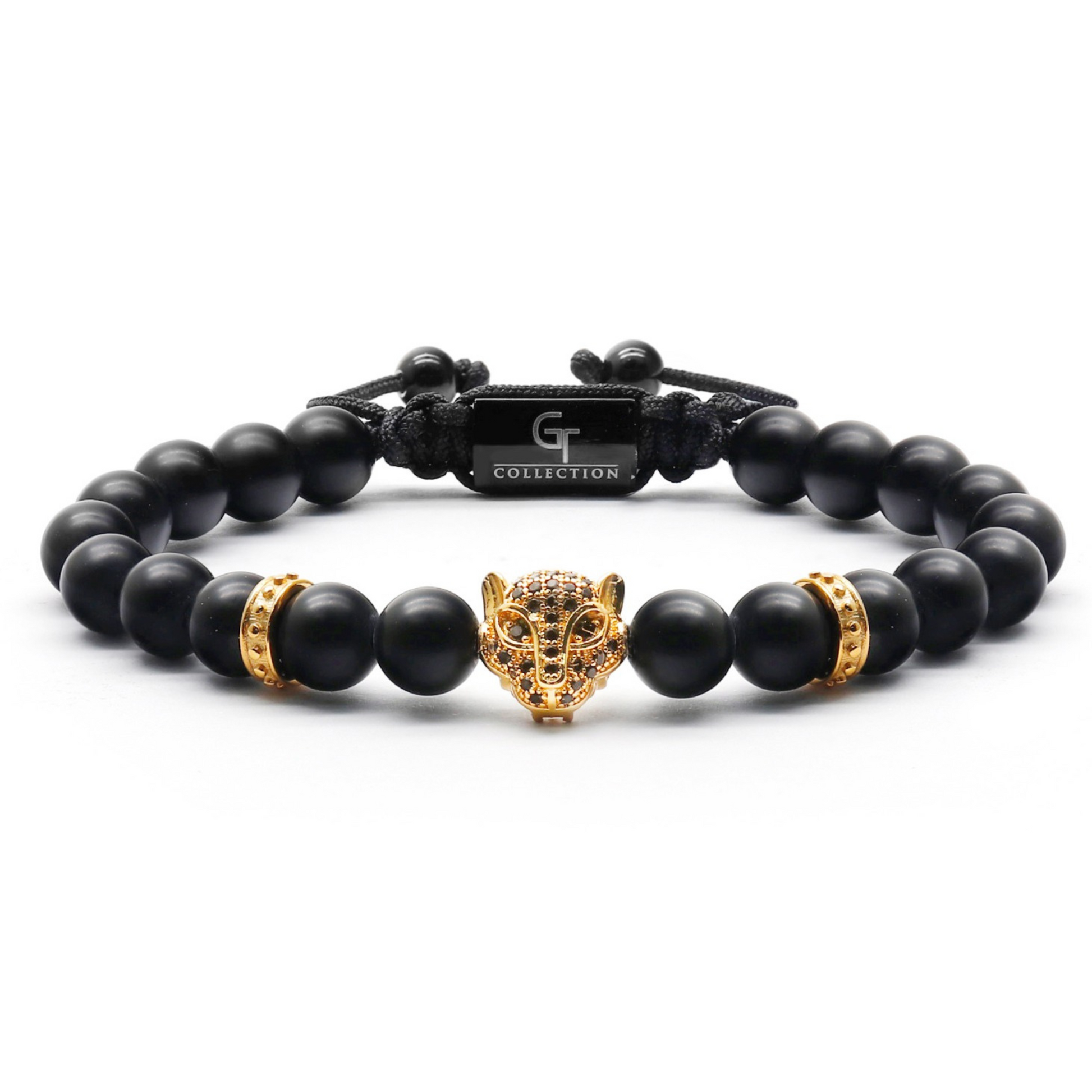 Men's BLACK ONYX Bracelet With Golden LEOPARD Head