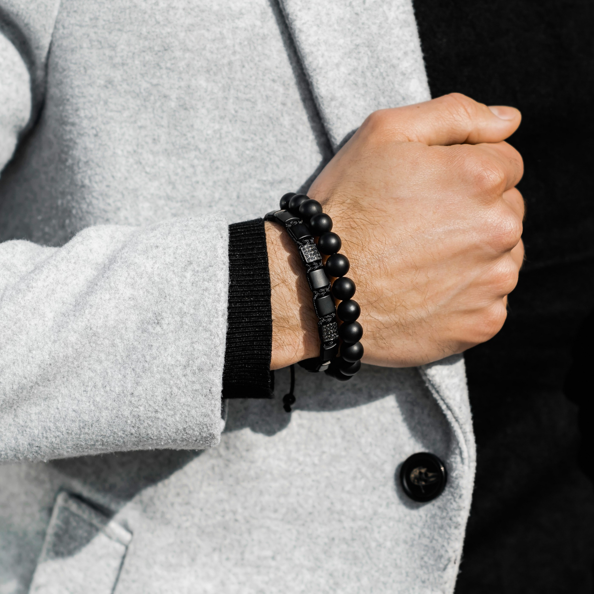 2 PIECE SET - BLACK ONYX Single Bead Bracelet And Flatbead Bracelet