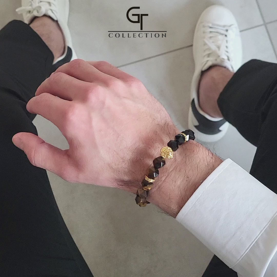 Men's TIGER EYE, ONYX Bracelet with Golden LION Head